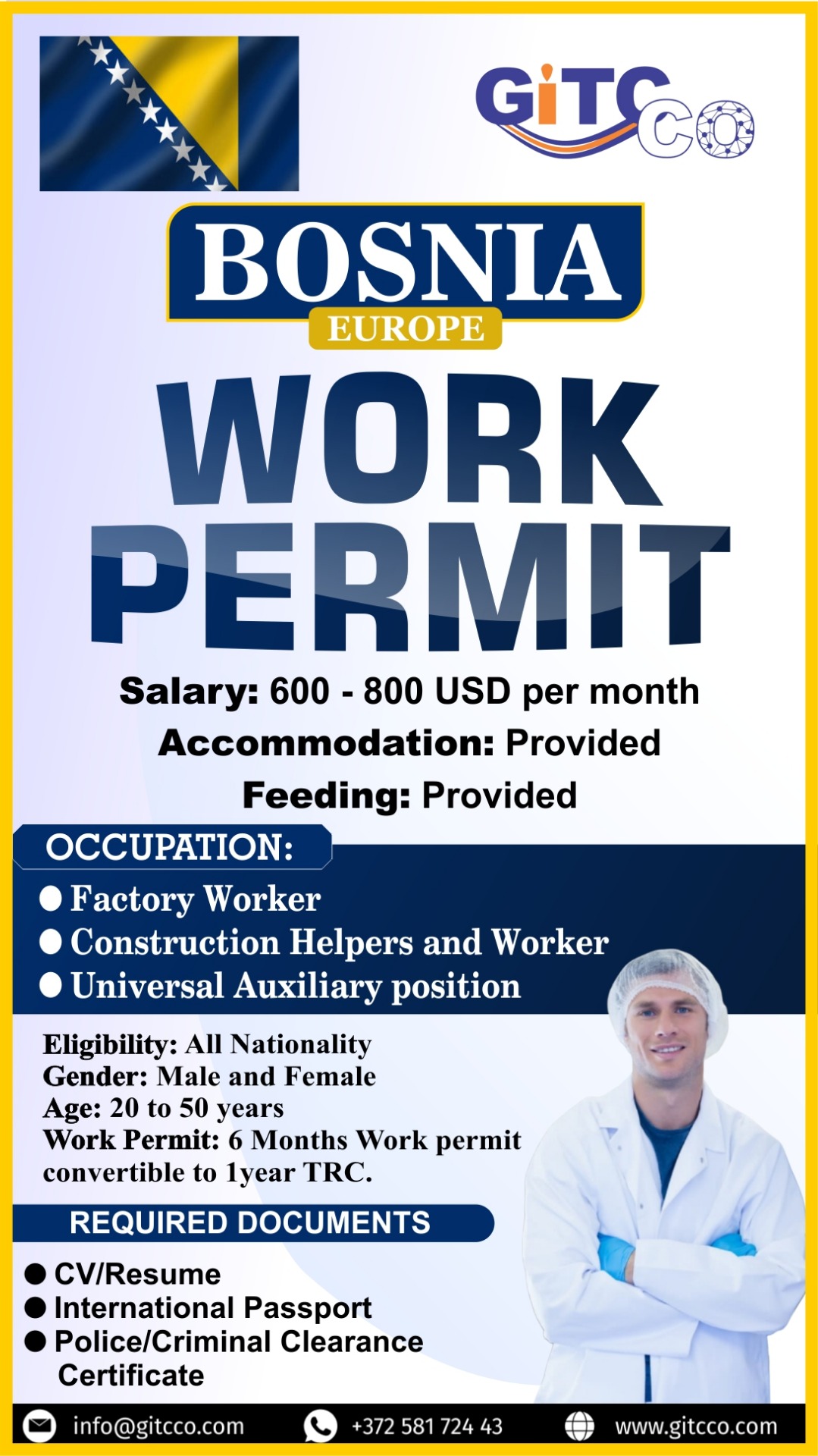 info@gitcco.com with the subject Bosnia Job - (Occupation that you are