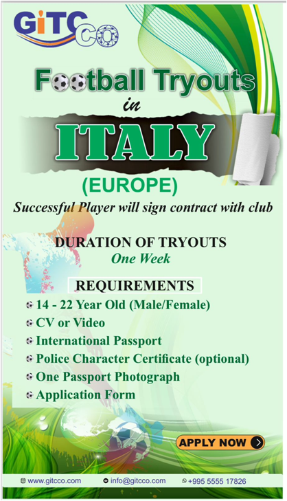3. Complete application form on our website using this link: https://www.gitcco.com/client-onboarding/ or Send the compiled documents to info@gitcco.com with the subject Football Tryout in Italy.