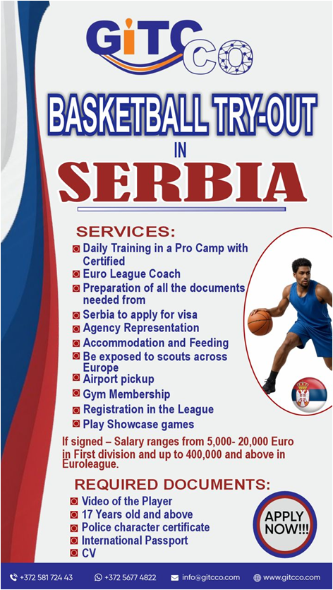 3. Complete application form on our website using this link: https://www.gitcco.com/client-onboarding/ or Send the compiled documents to info@gitcco.com with the subject Basketball Tryout In Serbia