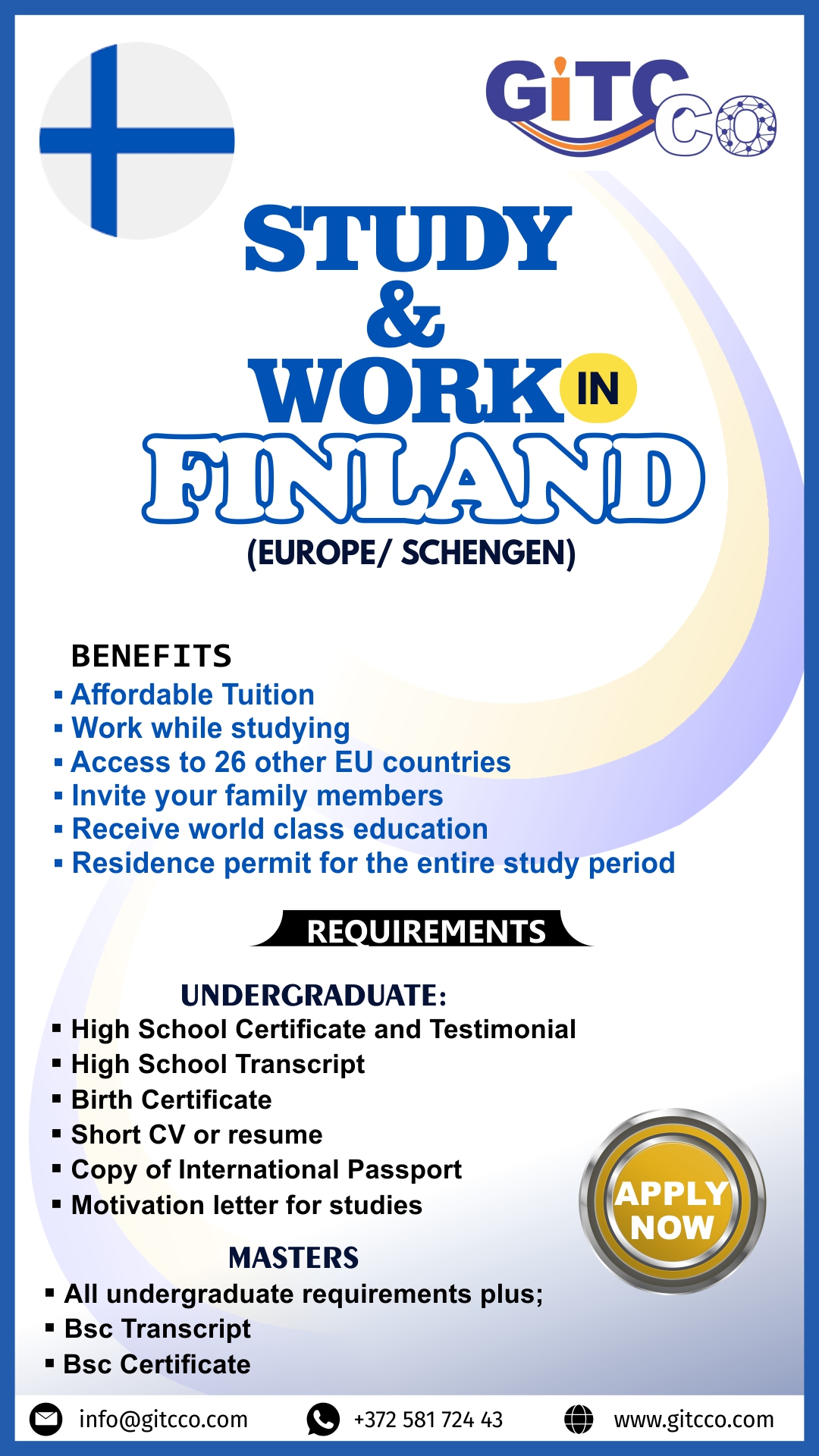 We are pleased to inform you that we have commenced processing of admission and visa/working permit for students who wish to study in Finland Universities at undergraduate, Masters Level and PhD level.