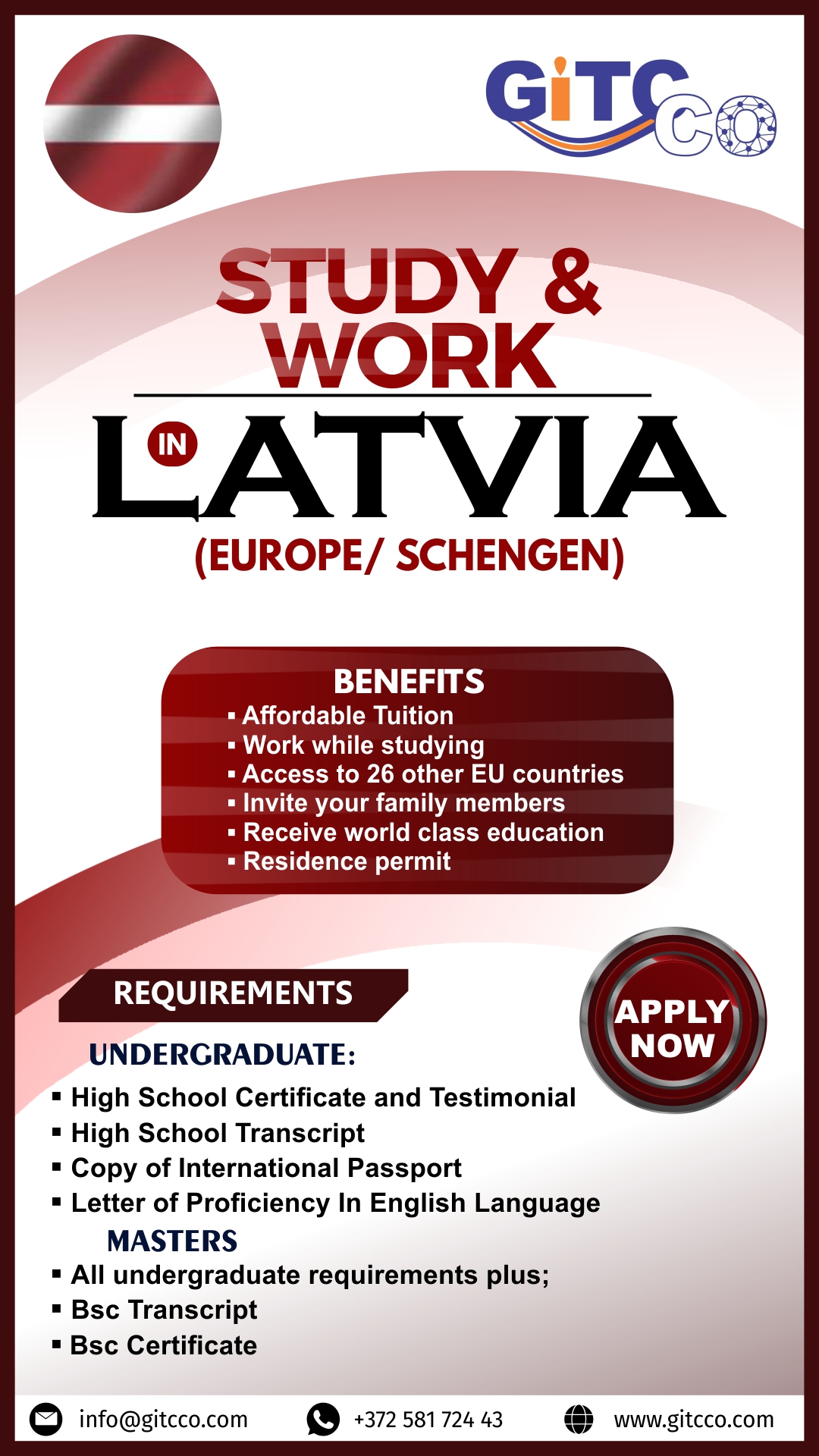 STUDY AND WORK IN LATVIA (EUROPE) WITH THE OPTION OF PAYING PAYING PROCESSING FEE AFTER VISA