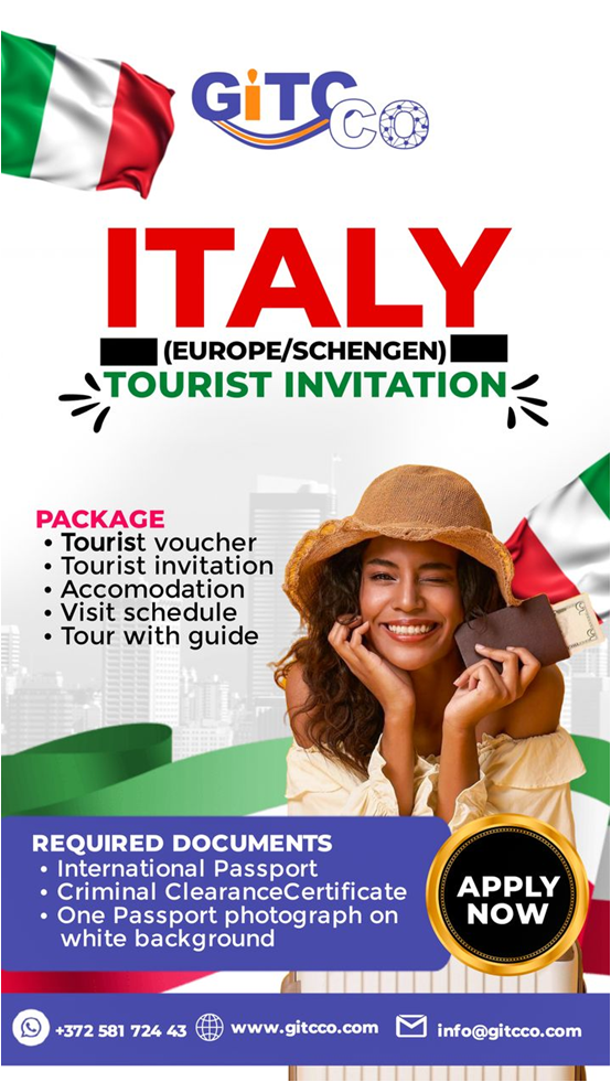 3. Complete application form on our website using this link: https://www.gitcco.com/client-onboarding/ or Send the compiled documents to info@gitcco.com with the subject Italy tourist invitation - (Package that you are applying for)